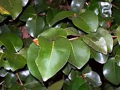 Las hojas son opuestas, simples, enteras, ampliamente ovadas o elípticas, de 5 a 10 cm de largo. Redondas o retraídas a una punta roma, o a veces cortadas. Tiene numerosos puntitos aceitosos pequeños. Los tallos de las hojas muy cortos.