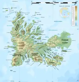 Mapa topográfico del archipiélago de los Kerguelen, a la izquierda está la bahía