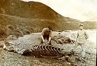 Un trabajador ballenero desgüezando una ballena en la bahía. Foto tomada en 1924.