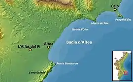 Limitada por acantilados, al norte por el Morro de Toix y al sur por la punta Bombarda, el frente litoral con unos 10 kilómetros es de costa baja, con playas y calas. Se encuentra fuertemente urbanizado para viviendas residenciales de uso turístico. En la bahía desemboca el río Algar (12,2 km). Los islotes la Olla y Pila se sitúan cerca la costa.[1]