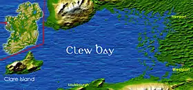 - Esta obra contiene una traducción derivada de «Clew Bay» de Wikipedia en inglés, publicada por sus editores bajo la Licencia de documentación libre de GNU y la Licencia Creative Commons Atribución-CompartirIgual 3.0 Unported.