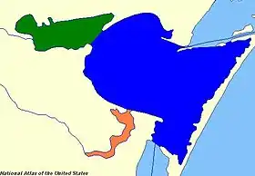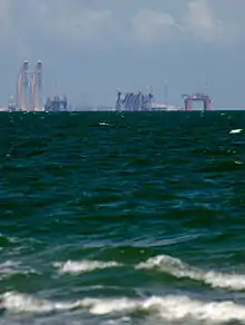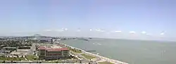 ![]() Vista área con la bahía de Corpus Christi (dcha.), bahía Nueces (arriba) y bahía Oso (abajo) | ||