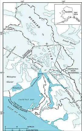 La bahía de Yakutat fue el epicentro de dos terremotos de gran magnitud el 10 de septiembre de 1899, uno de magnitud 7,4, premonitor, y el otro de magnitud 8,0, el sismo principal, con 37 minutos de diferencia.[1]