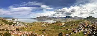 ![]() Vista de las aguas de la bahía interior de Puno que bañan las riberas de la ciudad de Puno. | ||