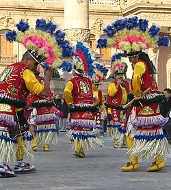 La tradición del baile folclórico moderno de México es una mezcla de elementos de su patrimonio indígena y europeo. Antes de la llegada de los españoles, la danza indígena se había desarrollado con fuertes lazos con las prácticas religiosas.[1] Para los aztecas, había dos niveles de la danza, una para la gente común, a menudo relacionada con el ciclo agrícola y la de los élites . Después de la Conquista, los españoles inicialmente trabajaron en erradicar las danzas indígenas, por considerarlas "demasiado paganas" y tuvieron éxito con una serie de formas, especialmente las relacionadas con el sacerdote y las clases dominantes.[1][2] Sin embargo, no fueron capaces de erradicar las formas más populares, sobre todo en las regiones rurales y más inaccesibles de la Nueva España. En cambio, los evangelizadores trabajaron para adaptar las danzas al cristianismo, dándoles nuevos significados. Por esta razón, la mayoría de estas danzas han sufrido al menos alguna modificación desde la época prehispánica.[1][3]