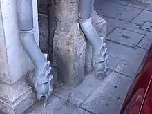 Suelen ser de cinc o hierro y se sujetan a las paredes por medio de collares con patillas, empotradas en la fábrica o con ataduras de alambre sostenidas por horquillas de hierro. En la parte superior, que ajusta con la canal, suelen ensanchar en forma de cubierta, para recoger mejor las aguas y por su parte inferior desaguan en las aceras, en el arroyo, por debajo de éstas o en la alcantarilla, sistema que se va imponiendo en las grandes poblaciones.