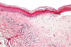 ![]() Microfotografía de liquen escleroso que muestra la esclerosis subepitelial característica (derecha/abajo de la imagen). Tinción hematoxilina-eosina. | ||