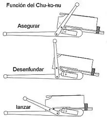 Era manejada moviendo una palanca hacia adelante y hacia atrás. En aquel movimiento, una flecha se colocaba en posición, la cuerda era tensada y mientras la flecha se disparaba, la siguiente estaba lista para tomar su lugar.