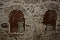 Interiormente se puede acceder al lugar donde se halla el manantío del agua termal; se trata de un espacio circular cubierto con bóveda y toma de luz cenital, pudiéndose observar las partes altas de las hornacinas del medio punto rehundidos con el muro, quedando el resto bajo el actual nivel del suelo, estando en la actualidad el centro de la construcción circular ocupado por una cámara de ladrillo de metro y medio de alto que protege la pileta, a donde llega el agua para su distribución. Por la parte alta de la cámara citada se accede a un hueco donde se aprecia un tronco de columna con fuste y pileta octogonal con ocho pequeños orificios. Esta terma responde al concepto de terapéutico, debiendo estar adscrito este lugar de Baños de Montemayor al importante enclave de Cáparra.