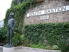 El Baluarte Sur tiene caras irregulares, junto al mar tiene trescientos pies de largo, y al lado de las arenas rojas doscientos sesenta: este baluarte se eleva más alto que la línea del muro, para proteger la ciudad de las colinas de arena. Y dentro del área a tiro, en la cara sur hay cuatro alfeizares, el flanco tiene un antepecho, y un flanco retirado con dos alfeizares para controlar la zanja.[2]