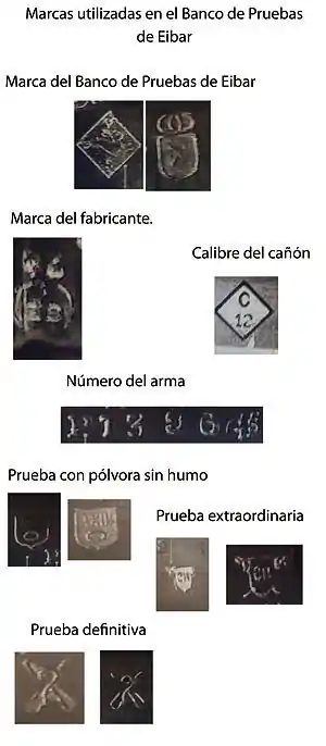 El Banco Oficial de Pruebas de Éibar se fundó en 1916 y depende del Ejército de Tierra español. Desde 1927 todas las armas españolas deben pasar por él y son marcadas mediante punzones, normalmente en el armazón o en la corredera en caso de las pistolas y revólveres, o en la báscula o cajón de mecanismos en escopetas y armas largas.[2] Forma parte de la Comisión Internacional Permanente para las pruebas de pequeñas armas de fuego portátiles (CIP).