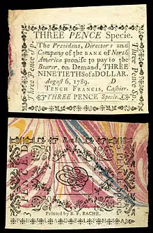 En 1783, el Congreso y varios estados, incluyendo Massachusetts, promulgaron una legislación que permitía a los ciudadanos americanos a pagar impuestos con certificados del Banco de Norteamérica, asignándoles la característica fundamental de moneda de curso legal.[13]
