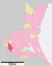 La ciudad se encuentra ubicada en la región occidental de la Prefectura de Ibaraki, al noreste del río Tone.
