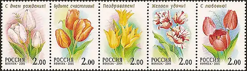 Banda horizontal (serie) de cinco estampillas de vacaciones con ilustraciones de diferentes especies de tulipanes (Rusia, 2001).