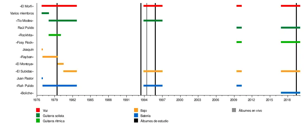 Juan «Raf» Pulido Modesto Agriarte («Tío Modes» o "El Metralleta») Emilio Hita («Rockhita») Salvador Solano («Rayban» o «El Llobregat») Feliciano Montoya («El Montoya») Alberto Chazarra Joaquín «Bubi» Tony López Jaume Planas Pedro («Peret» o «Peter») Planas Carlos Motos («Cordiola») «Madera Bill» Javier Otopac Raúl «El Loli» Juan Pastor Juano Montero «Betty Love» | ||