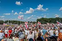 La bandera blanca-roja-blanca, la bandera oficial de la Bielorrusia independiente entre 1991 y 1995, fue recogida por la oposición a favor de la democracia del país, convirtiéndose en un símbolo poderoso. Prohibida oficialmente por las autoridades, la policía frecuentemente confiscaba la bandera en las manifestaciones,[7] y la bandera es un símbolo para cualquiera que se oponga activamente a Lukashenko.[8] Durante las protestas en Bielorrusia de 2020 contra el fraude electoral en las elecciones presidenciales la bandera es masivamente empleada durante las manifestaciones de la sociedad civil.