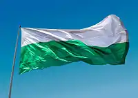 La Bandera está conformada por dos franjas horizontales, blanca en la parte superior y verde en la parte inferior, y cada una de ellas con un ancho igual a la mitad de la bandera.