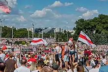 Desde 1995, la bandera blanca-roja-blanca se usa como símbolo de la oposición al régimen de Aleksandr Lukashenko, principalmente en las protestas que siguieron a las elecciones presidenciales de 2006 y 2010 y en las manifestaciones conmemorativas del Día de la Libertad y en las marchas conmemorativas de Dziady. El uso de la bandera de manera pública no se encuentra prohibido pero es considerado por las autoridades un símbolo sin registrar, por lo que su muestra por activistas políticos o hinchas deportivos puede suponer el arresto y la confiscación de las banderas.[14]