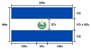 La Bandera de El Salvador consiste de tres franjas horizontales iguales, los dos azules que están en la parte superior y en la parte inferior, y el blanco se ubica en el centro de la bandera.[5][6] La variación vigente se distingue en tres tipos en función de su uso, la Bandera Magna se lleva con el Escudo Nacional en la franja central, el uso civil tiene dos versiones: la primera dejada en blanco a la franja central, y la segunda se lleva de un lema salvadoreño en la franja central.