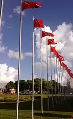 - Cuando se ondea, la bandera nacional debe estar siempre en el extremo izquierdo de todas las demás banderas y al mismo nivel que las demás.