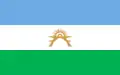 Diseño | 3 franjas de tamaño 1:1:1, la central de blanco y las otras 2 de celeste y un sol de 32 rayos, 16 ondulados y 16 rectos con bordes marrones en el medio de la franja blanca | |