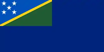 La bandera nacional de las Islas Salomón fue adoptada oficialmente el 18 de noviembre de 1977. Está dividida por una banda de color oro (amarilla) trazada sobre una de sus diagonales. El triángulo superior al asta de la bandera es de color azul y la inferior es verde. En el triángulo azul, cerca del borde más próximo al asta, figuran cinco estrellas blancas de cinco puntas agrupadas.