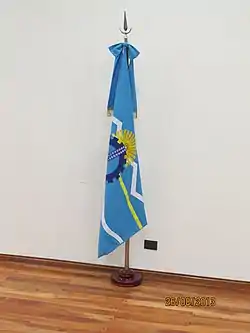 Diseño | Bandera de color celeste con una rueda de engranaje en el centro, sobre esta se encuentra un sol naciente con 16 rayos. Dentro del engranaje se encuentra la simbología del escudo provincial. El engranaje también es atravesado por detrás por una línea amarilla. En la parte superior de la bandera se encuentra una línea blanca zigzagueante, y en su parte inferior, una línea blanca ondulada. | |