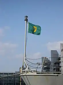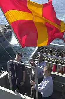 La bandera de proa de los buques de guerra también indica nacionalidad, y se iza en el torrotito.