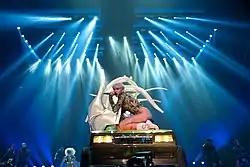 Adicional eso, la artista se presentó en diversos eventos y ceremonias de premiación, una en particular fue la que realizó en los MTV Video Music Awards de 2013, en la cual hizo twerking mientras cantaba «We Can't Stop» y posteriormente «Blurred Lines» con Robin Thicke, diversos medios de comunicación y el público la catalogaron como muy «provocadora» y «subida de tono».[21] Con esta actuación la cantante consiguió 360 000 tuits por minuto, rompiendo el récord que había impuesto Beyoncé durante su presentación en el Superbowl en ese mismo año.[22] Cabe destacar que los dos primeros sencillos del álbum recibieron múltiples galardones, donde destacan el premio al mejor vídeo femenino en los MTV Video Music Awards Japan por «We Can’t Stop» o mejor vídeo por «Wrecking Ball» por los Billboard Music Awards, los World Music Awards y los MTV Europe Music Awards y vídeo del año en los MTV Video Music Awards de 2014.[23][24][25][26] Además en diciembre de 2014, Bangerz recibió una nominación en los Premios Grammy de 2015 en la categoría mejor álbum de pop vocal.[27]