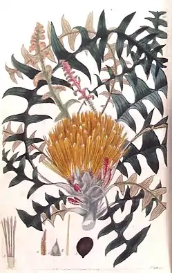 Banksia: nombre genérico que fue otorgado en honor del botánico inglés Sir Joseph Banks, quién colectó el primer espécimen de Banksia en 1770, durante la primera expedición de James Cook.