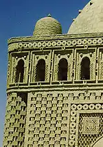 En el minarete de la ciudad de Gazni, construido en torno al año 1100, encontramos el primer ejemplo de caligrafía grabada en ladrillo. En este minarete afgano podemos leer el nombre del gobernante gaznaví Masud III y sus respectivos títulos. Para crear dicha inscripción se insertaron trozos de terracota entre los ladrillos. Algunas edificaciones posteriores se sirvieron de la sombra proyectada por ladrillos en relieve para escribir palabras, mientras que otras utilizaron ladrillos de diferentes colores. Está práctica llevó finalmente al recubrimiento total de los edificios de ladrillo con inscripciones sagradas que ensalzaban los nombres de Alá, Ali y Mahoma.