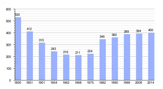Los datos demográficos contemplados en este gráfico de la comuna de Banneville-sur-Ajon[4] se han cogido de 1800 a 1999 de la página francesa EHESS/Cassini, y los demás datos de la página del INSEE.[5]