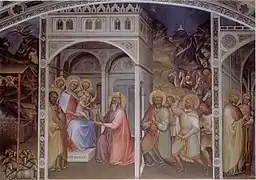 El pintor retoma así la idea sienesa de edículos arquitectónicos articulados en diversos espacios, desarrollada en particular para las Natividades de la Virgen. La transferencia de esta idea a un tema que no la implica es particularmente importante. La arquitectura sigue siendo desproporcionada para los personajes, pero las aberturas existentes, las direcciones de posibles recorridos se multiplican: el espacio ya no es una yuxtaposición de celdas cerradas, se convierte en un continum que atraviesa los distintos «entornos» de la historia.[5]