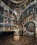 En la pared adyacente al altar está representada la Crocifissione [Crucifixión], luego el descenso del Spirito Santo (fresco en la cúpula del altar). En el altar hay un políptico de Giusto dei Menabuoi. En las paredes alrededor del altar, en el ábside, pintadas al fresco hay figuras monstruosas e imágenes tomadas del Apocalipsis de Juan.[2]