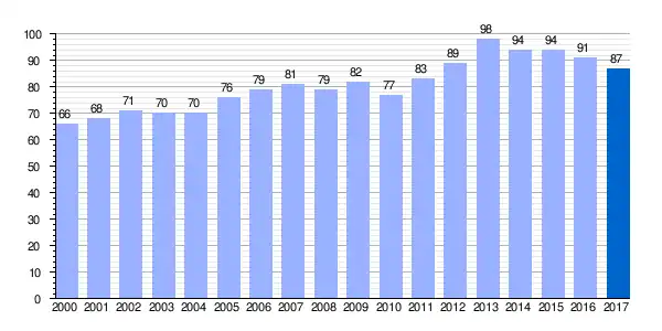 Gráfica de evolución demográfica de Barajuén[6] entre 2000 y 2017 |