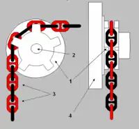 Diagrama: 1) corona de barbotín, 2) eje del cabrestante, 3) grilletes de la cadena (con contrete) y 5) cinta de freno.