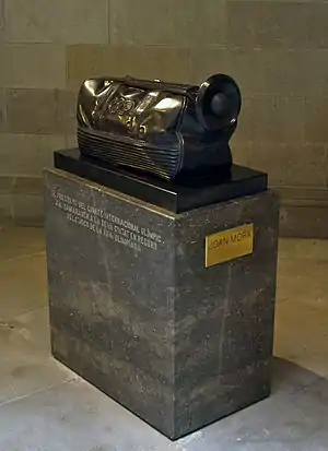 La obra fue realizada por el picapedrero y marmolista Joan Mora en el taller que posee en San Andrés de Palomar (Barcelona) en 1996, por encargo de Juan Antonio Samaranch, por aquel entonces, presidente del Comité Olímpico Internacional. La obra, realizada con piedra negra de Calatorao, representa una maleta con una antorcha olímpica hiperrealista, como agradecimiento del presidente del COI a Barcelona tras los Juegos que albergó la ciudad en 1992.