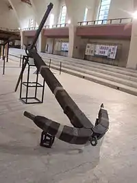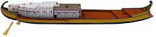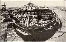 ![]() Parte del casco de la primera nave o barco de Nemi sostenido por un armazón. | ||