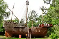 La carabela fue una nave desarrollada por los portugueses, fue perfeccionada en la Escuela de Navegación de Sagres, fundada por Enrique el Navegante a principios del siglo XV; el modelo portugués se impuso al resto de la península ibérica, sobre todo en Andalucía, donde se creó la carabela de aparato redondo, y se utilizó desde el siglo XV para los viajes de exploración oceánica.[16] A diferencia del drakar y la coca, se utilizó el método de construcción Carvel. Podría ser cualquier aparato de vela cuadra y vela latina (Carabela redonda) o solamente vela latina (Carabela latina). Los ejemplos más famosos de carabelas fueron La Niña y La Pinta.