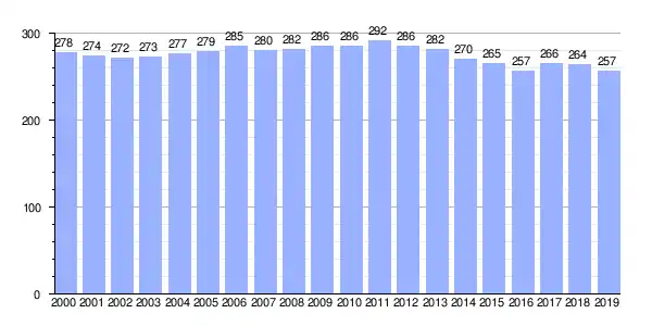Gráfica de evolución demográfica de Bardaos entre 2000 y 2019 |