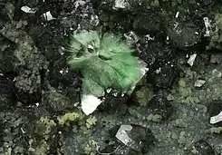 Se encuentra como agrupaciones divergentes de cristales laminares de contorno rectangular, de color verde claro, traslúcidos, muy frágiles, de tamaño milimétrico. Es un mineral extraordinariamente raro, que aparece como mineral secundario asociado a pizarras carbonosas, que han actuado concentrando el vanadio. Se encuentra en la localidad tipo, Spring Creek, en Australia,[1] y en las pizarras que aparecen en la cantera de magnesita de Eugui, en Esteribar (Navarra).[2]