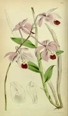 Es una orquídea de pequeño tamaño, que prefiere el clima cálido, con hábito creciente epífita con 4-9 pseudobulbos muy delgados, 4-9 que llevan 2-7 hojas dísticas, muy carnosas, lineares a lanceoladas, acuminadas a subagudas, de color verde oliva. Florece en una inflorescencia apical, racemosa a paniculada, con algunas flores cada una, 2-3 ramificado, de 5 a 50 cm de largo, con 1-3 flores envueltas con brácteas ovales, obtusas a agudas, cóncavas, marrón, brácteas florales escariosas que se produce en el otoño y el invierno en los cultivos y en la primavera en la naturaleza. Esta es la especie tipo del género.[1]