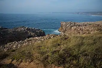 La costa de Barlovento está protegida por el parque natural del Suroeste Alentejano y Costa Vicentina. Ésta se caracteriza por grandes acantilados como los de la Fortaleza de Sagres y formaciones rocosas y de vez en cuando alguna playa arenosa. El color de la arena va de amarillo a rojo.