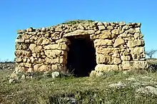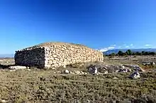 La construcción posee planta rectangular, está orientada en sentido este-oeste, con la entrada mirando al levante, los muros de mampostería de piedra en seco (sin aglomerantes), con cobertura basada en grandes losas planas, formando una falsa cúpula cubierta de tierra. Respecto a los elementos constructivos más llamativos: