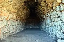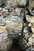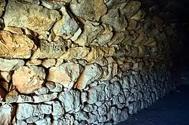 - Paredes internas: que se elevan a plomo varias tongadas de piedra, a modo de zócalo, hasta alcanzar los 120 cm de alto, desde este punto las losas que forman la pared van aproximándose en suave curvatura hasta la cúspide -por el contrario de las exteriores, que ascienden rectas, lo que evidencia la existencia de una doble pared: