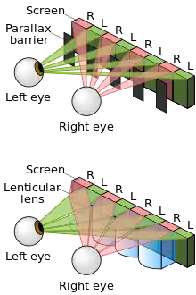 Una barrera de paralaje se basa en un patrón periódico de regiones opacas "no transmisible" y regiones transparentes "transmisibles" colocadas en frente de un dispositivo de visualización, como puede ser una pantalla de cristal líquido, generando finalmente diferentes imágenes para cada ojo según nuestra visualización de las regiones. Las regiones acostumbran ser paralelogramos debido a su fácil distribución en forma de columnas y siguiendo una simetría para que cada ojo visualice únicamente una imagen.[1]
