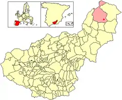 Situación de Barrio Nuevo de San Clemente respecto al término municipal de Huéscar, en la provincia de Granada.