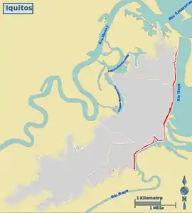 ![]() Las dos subdivisiones del Barrio de Belén: Alto Belén en primer plano asentada sobre la Loma de Vizcarra/Pijuayo Loma, y Bajo Belén ubicado al fondo en extensión hacia el río Itaya.