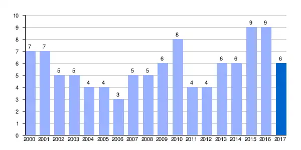 Gráfica de evolución demográfica de Barrundia[1] entre 2000 y 2017 |