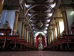 La basílica tiene tres naves separadas por dos filas de columnas y arcadas. Presenta un estilo neoclásico y mide 17 metros de altura y 65 de profundidad. Posee una planta en forma de cruz latina con tres naves y una cúpula de gran magnitud, situada en el cruce de la nave central con el transepto, que ha sido cubierta con material impermeable, lo cual oculta su transparencia y su construcción en cristal de colores con linternas estilo grecorromano. Debajo de ella, en el presbiterio, hay una escultura del Sagrado Corazón.